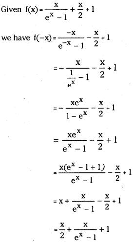Case II : f (-1) = 2, and f (1) = 0 then – a + b = 2 and a + b = 0 Solving b = 1, a = -1 Hence a = + 1 and b = 1 Question 7. If f(x) = cos (log x), then show that f(1/x) f(1/y) – (1/2)[f(x/y) + f(x/y)] = 0 Answer: Given f(x) = cos(log x) then f(1/x) = cos(log(1/x)) = cos(-log x) = cos(log x) (∵ log 1 = 0) Similarly f(1/x) = cos(log y) f(x/y) = cos(log(xy)) = cos(log x – log y) f(x/y) = cos (log xy) = cos [log x + log y] f(x/y) + f(x y) = cos(log x – log y) + cos (log x + log y) = 2 cos (log x) cos (log y) (∵ cos (A – B) + cos (A + B)) = 2 cos A cos B f(1/x) f(1/y) – (1/2)[f(x/y) + f(x/y)] = cos (log x) cos (log y) – 1/2 [2cos (log x) cos (logy)] = 0